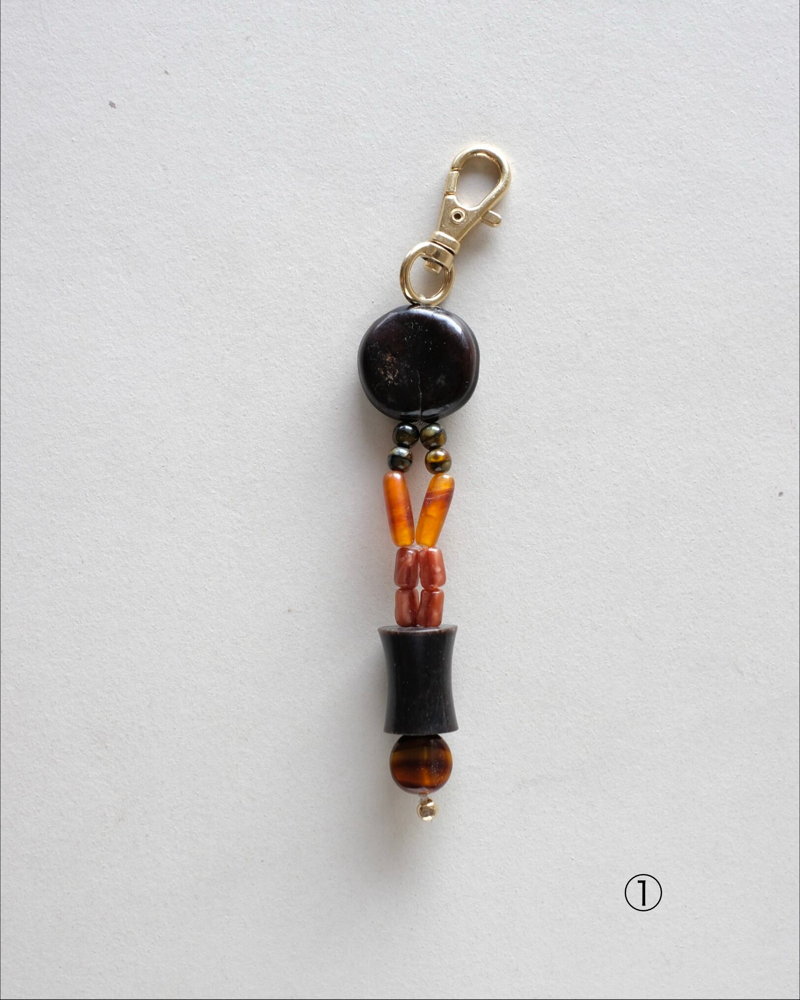 ①チェコビーズ、ホーンビーズ、木の実(リュウガン)